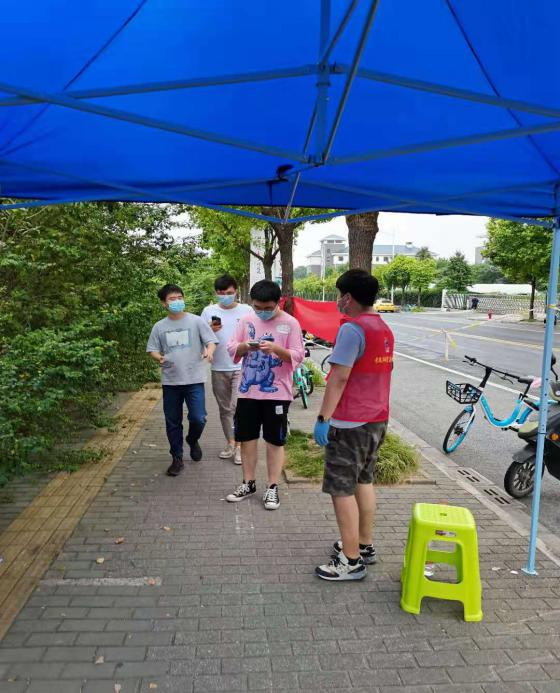 沖在一線,當(dāng)先鋒。正逢南京酷暑,毛曉春與孫斌負責(zé)在入口處查驗健康碼,協(xié)助市民綠碼通行。“您好,請帶好口罩?!薄澳?,請出示健康碼。”作為檢測點第一道關(guān)口,兩位男同胞展現(xiàn)了不輸女性的耐心與溫柔:個別老人家沒有相關(guān)軟件,個別市民沒有及時更新數(shù)據(jù),他們手把手提供幫助與支持,烈日下的背影早已汗如雨下。