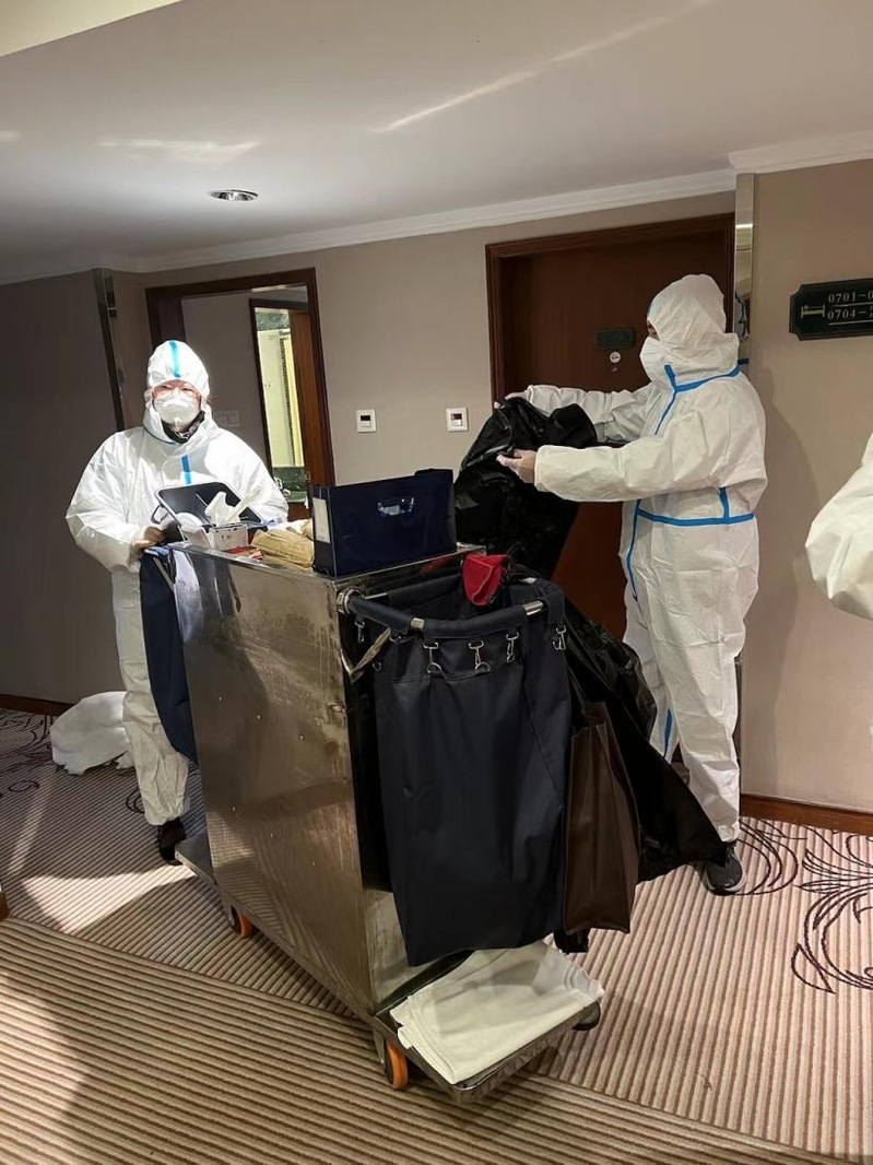 奧密克戎病毒隱匿強傳播快,從9號—13號,管控區(qū)的23名員工就倒下了近三分之一,伴隨有癥狀的員工越來越多,而亟待消殺清理的“小陽人”病毒房也越來越多,眼看管控區(qū)的日常運轉(zhuǎn)就要癱瘓。為了堅守賓館運轉(zhuǎn),更是為了跑贏病毒,由許書記、工程部王迪智經(jīng)理、營銷部王兵經(jīng)理、樓層謝黎英主管組成的第一梯隊無懼身體還發(fā)著燒、克服氣喘、乏力的陽性癥狀,果斷下沉帶頭進行清掃工作。樸實無華的身體力行,默默無聞的奉獻精神,點點螢火匯成了戰(zhàn)疫星河,是上級與下屬,是領(lǐng)導(dǎo)與員工,這一刻,我們更是并肩抗疫搭把手的戰(zhàn)友。