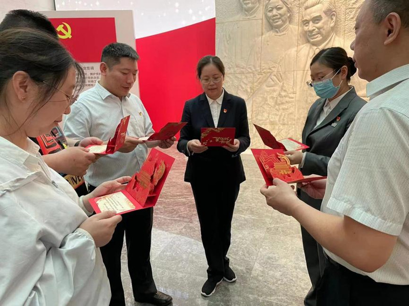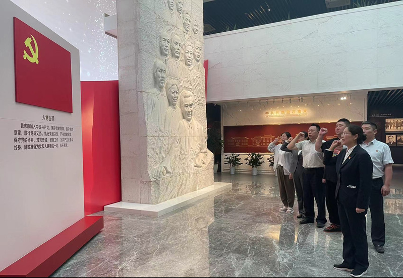 首先,全體黨員來到陳列廳正中央,面對漢白玉浮雕和鮮紅的黨旗重溫入黨誓詞,回顧入黨時的莊嚴(yán)承諾和初心使命,進一步增強理想信念。